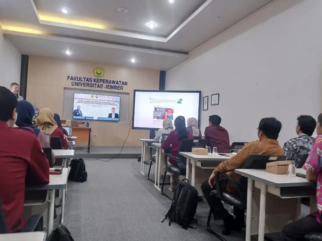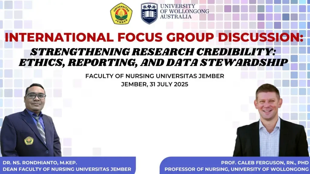 Fakultas Keperawatan Universitas Jember (FKep UNEJ) kembali menunjukkan komitmennya terhadap penguatan kualitas akademik melalui penyelenggaraan Forum Group Discussion (FGD) bertajuk Strengthening Research Credibility: Ethics, Reporting, and Data Stewardship. Acara ini menghadirkan pakar internasional, Prof. Caleb Ferguson, RN., PhD., dari University of Wollongong, Australia, sebagai pembicara utama.