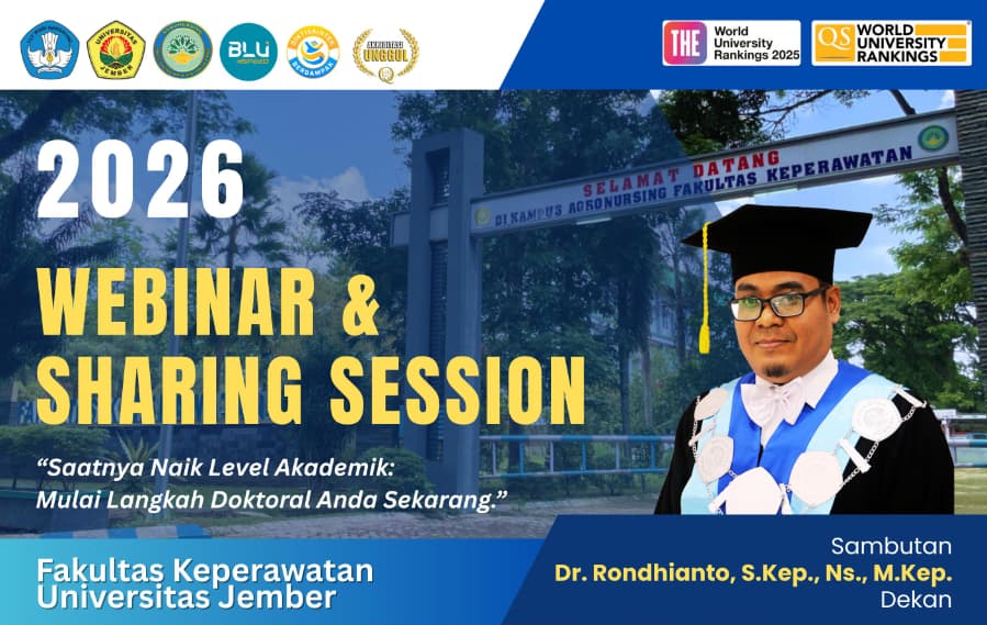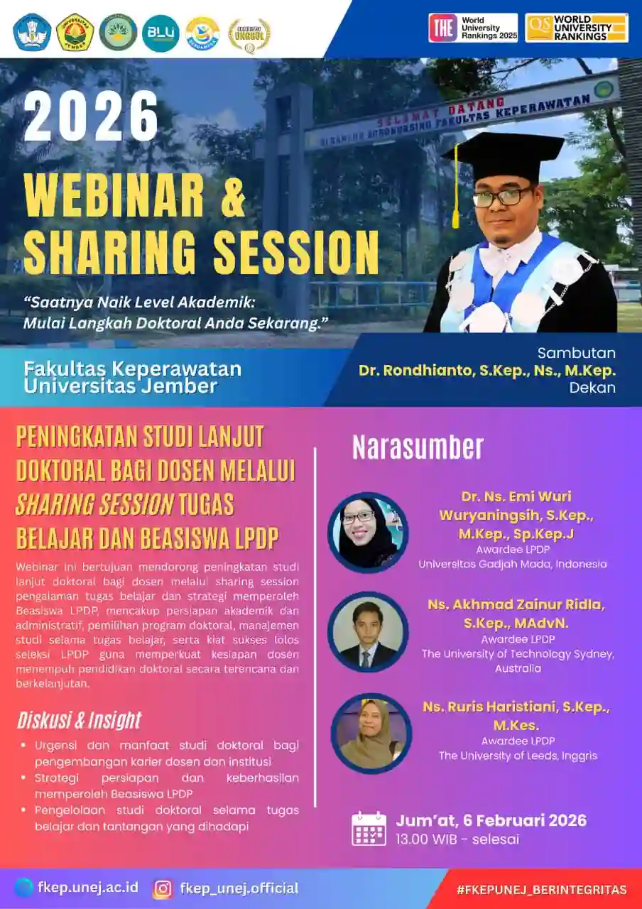 Fakultas Keperawatan Universitas Jember (UNEJ) terus menunjukkan komitmennya dalam meningkatkan kualitas sumber daya manusia, khususnya dosen, melalui penguatan budaya akademik dan dorongan untuk melanjutkan studi ke jenjang doktoral. Salah satu upaya konkret tersebut diwujudkan melalui penyelenggaraan webinar & sharing session bertajuk “Webinar Peningkatan Studi Lanjut Doktoral bagi Dosen melalui Sharing Session Tugas Belajar dan Beasiswa LPDP” yang diselenggarakan secara daring dan diikuti oleh seluruh dosen di lingkungan Fakultas Keperawatan Universitas Jember.