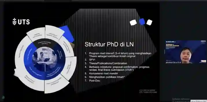 Sesi berikutnya diisi oleh Ns. Akhmad Zainur Ridla, S.Kep., MAdvN, yang berbagi pengalaman melanjutkan studi doktoral di The University of Technology Sydney, Australia. Dalam pemaparannya, beliau menjelaskan perbedaan sistem pendidikan, budaya akademik, serta tantangan adaptasi yang dihadapi selama studi di luar negeri. Menurutnya, kesiapan bahasa Inggris, kemampuan manajemen waktu, dan kemandirian menjadi faktor kunci keberhasilan studi. Beliau juga memberikan tips praktis dalam memilih universitas tujuan, mencari calon pembimbing (supervisor), serta menyusun proposal riset yang kompetitif.