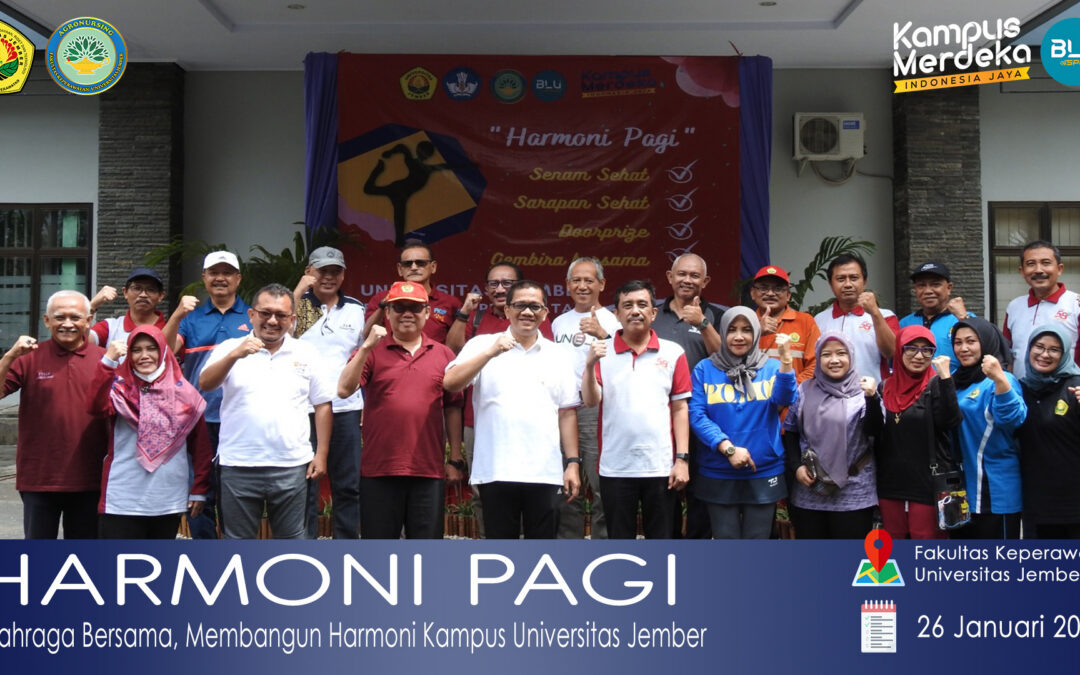 Setelah absen hampir selama tiga tahun karena pandemi Covid-19, kegiatan olahraga bersama keluarga besar Universitas Jember kembali digelar. Mengawali tahun 2023 ini yang menjadi tuan rumah adalah Fakultas Keperawatan (26/1). Dalam sambutannya, Dekan Fakultas Keperawatan, Ns. Lantin Sulistyorini, S.Kep., M.Kes. menyebut pemilihan Fakultas Keperawatan mengawali kegiatan olahraga bersama cocok dengan visi dan misi Fakultas Keperawatan yang mengemban tugas meningkatkan derajat kesehatan masyarakat melalui konsep Agronursing.[/vc_column_text][/vc_column][/vc_row][vc_row][vc_column][vc_single_image image=”11692″ img_size=”large”][/vc_column][vc_column][vc_column_text]Kegiatan diawali dengan senam bersama yang diikuti oleh Rektor, Wakil Rektor, seluruh Dekan dan ketua lembaga di lingkungan Universitas Jember. Turut serta perwakilan Kampus Lumajang dan Kampus Pasuruan beserta mahasiswa Fakultas Keperawatan. “Semoga kegiatan olahraga bersama ini menjadi awalan baik dalam melaksanakan berbagai program yang sudah kita rencanakan. Sebab dengan badan dan pikiran yang sehat maka mendorong kinerja yang sehat juga,” tutur Ns. Lantin Sulistyorini, S.Kep., M.Kes.[/vc_column_text][/vc_column][/vc_row][vc_row][vc_column][vc_single_image image=”11691″ img_size=”large” onclick=”img_link_large”][/vc_column][vc_column][vc_column_text]Sementara itu dalam sambutannya, Rektor Universitas Jember, Bapak Dr. Ir. Iwan Taruna, M.Eng., kegiatan olahraga bersama yang dinamakan Harmoni Pagi ini akan digelar setiap bulan dengan tuan rumah berganti-ganti. Tujuaanya mempererat silaturahmi diantara keluarga besar Universitas Jember, membangun kebersamaan, meningkatkan kesehatan dan menjadi sarana pertemuan membahas berbagai program dan permasalahan terkini di kampus. Pertemuan rutin ini sekaligus menjadi perwujudan Rapat Tinjauan Manajemen.[/vc_column_text][/vc_column][/vc_row][vc_row][vc_column][vc_single_image image=”11679″ img_size=”large”][vc_column_text]“Seusai berolahraga bersama, unsur pimpinan akan melakukan pertemuan yang hari ini mengagendakan dua hal utama. Yakni mengenai perubahan Organisasi dan Tata Kelola Universitas Jember yang membawa adanya jabatan baru seperti akan adanya Wakil Rektor empat dan jabatan lainnya. Kedua, sosialisasi pelaksanaan remunerasi sebagai konsekuensi perubahan status Universitas Jember dari satuan kerja menjadi Badan Layanan Umum,” jelas Dr. Ir. Iwan Taruna, M.Eng.[/vc_column_text][vc_column_text]Untuk kali pertama ini kegiatan olahraga bersama yang diberi nama Harmoni Pagi digelar di hari Kamis mengikuti kesibukan pimpinan Universitas Jember. Selanjutnya kegiatan akan digelar setiap hari Jumat minggu ketiga setiap bulannya. Selain diisi dengan kegiatan olahraga bersama, kegiatan yang diberi nama Harmoni Pagi Universitas Jember juga diisi dengan pembagian doorprize bagi peserta yang kebanyakan adalah mahasiswa. Sementara untuk kegiatan Harmoni Pagi bulan depan akan dilaksanakan di Fakultas Kedokteran Gigi. (iim)[/vc_column_text][/vc_column][/vc_row][vc_row full_width="stretch_row"][vc_column][vc_column_text][/vc_column_text][/vc_column][/vc_row][vc_row][vc_column][vc_gallery interval="3" images="11698,11699,11700,11701" img_size="full"][/vc_column][/vc_row]