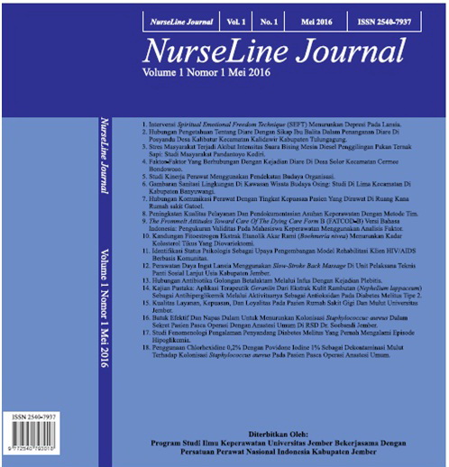 NurseLine Journal merupakan media ilmiah yang dapat digunakan untuk meregistrasi, mendiseminasi, dan mengarsipkan karya penelitian tenaga pendidik, tenaga PLP maupun tenaga Kependidikan. Karya yang dipublikasikan dalam jurnal ini secara tidak langsung diakui sebagai karya kecendekiawanan penulis dalam bidang keperawatan. Artikel antara lain meliputi sub bidang keperawatan dasar, keperawatan dewasa, keperawatan anak, keperawatan maternitas, keperawatan jiwa, keperawatan gerontik, keperawatan keluarga, keperawatan komunitas, manajemen keperawatan, dan pendidikan keperawatan. Jenis artikel yang diterima redaksi adalah hasil penelitian. Penulisan setiap jenis artikel harus mengikuti petunjuk penulisan