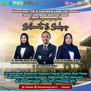 PASURUAN – Keluarga Besar Program Studi D3 Keperawatan Kampus Kota Pasuruan, Fakultas Keperawatan Universitas Jember, menyampaikan apresiasi dan selamat atas pencapaian luar biasa tiga dosen yang berhasil lolos seleksi dan memperoleh pendanaan program Penelitian Dosen Pemula serta Pengabdian Kepada Masyarakat (Pemberdayaan Mitra Masyarakat) dari Kementerian Pendidikan Tinggi, Sains, dan Teknologi (Kemendiktisaintek) untuk tahun pelaksanaan 2026.